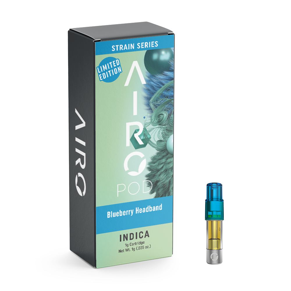 Relax your body into euphoria with the Strain Series Blueberry Headband by Airo Brands. Blueberry Headband is an Indica-dominant Hybrid strain created by crossing Blueberry with OG Kush, Sour Diesel, and Pre-98 Bubba. With dominant terpenes Limonene, Tangerine and Valencene, taste sweet, juicy blueberries as you inhale. As you exhale, let the sweet aromas fill the air as you release the tension from your body and mind and welcome a state of peaceful tranquility and contentment.